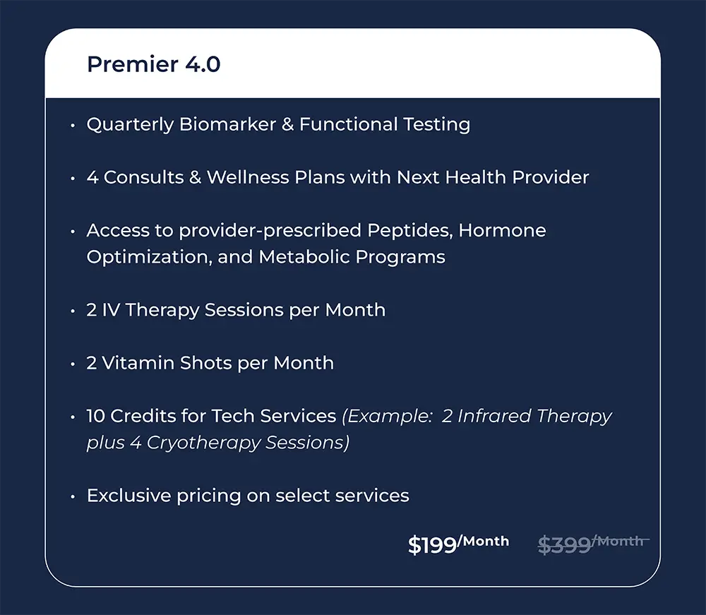 As a Next Health Member, you can gain access to: IV Therapy, Vitamin Shots, Cryotherapy, Infrared Therapy, and more.