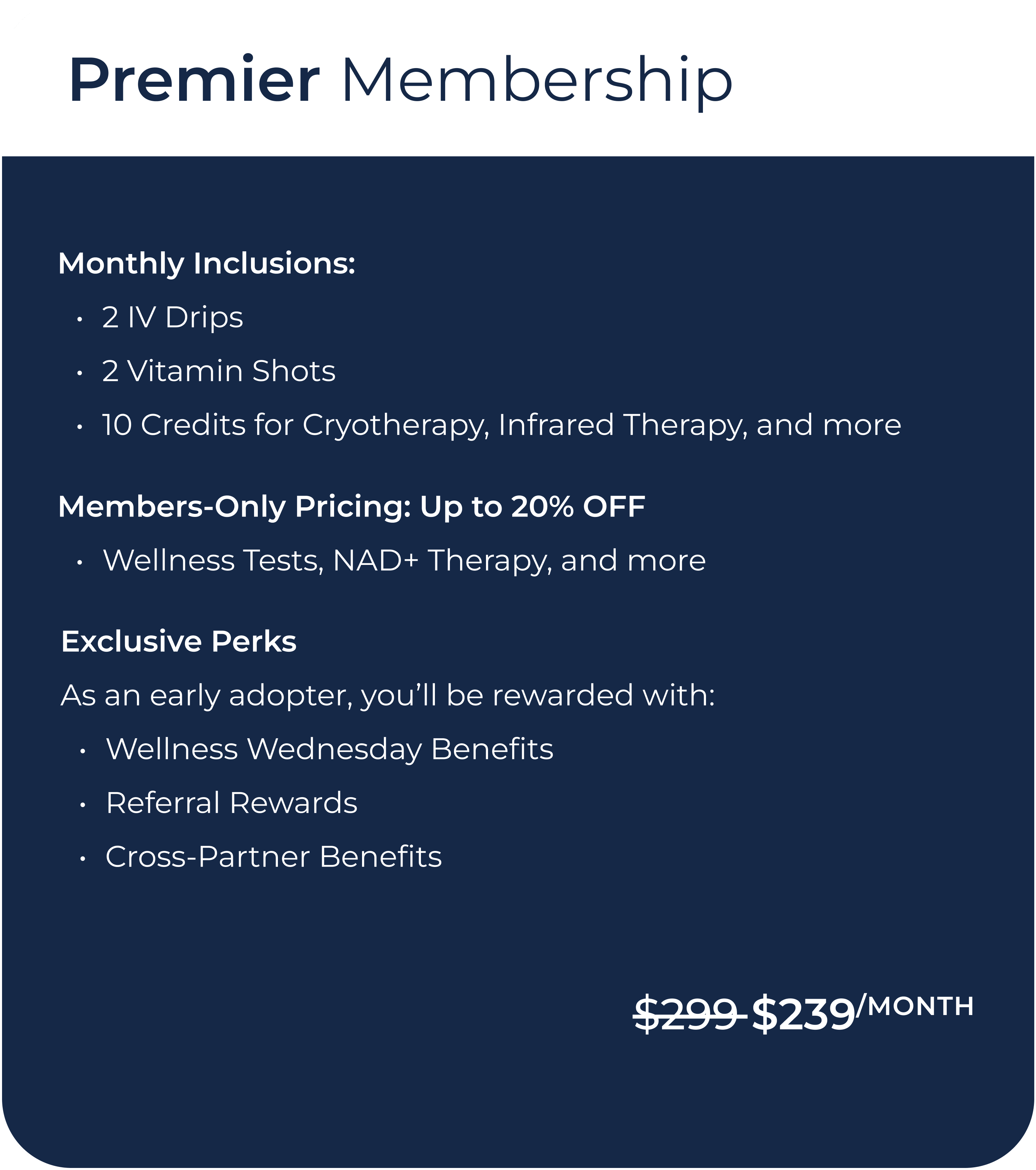 Secure your Founding Membership spot now and enjoy 20% off your Monthly Membership rate. As a Founding Member, your Membership includes: IV Therapy, Vitamin Shots, Cryotherapy, Infrared Therapy, and more.