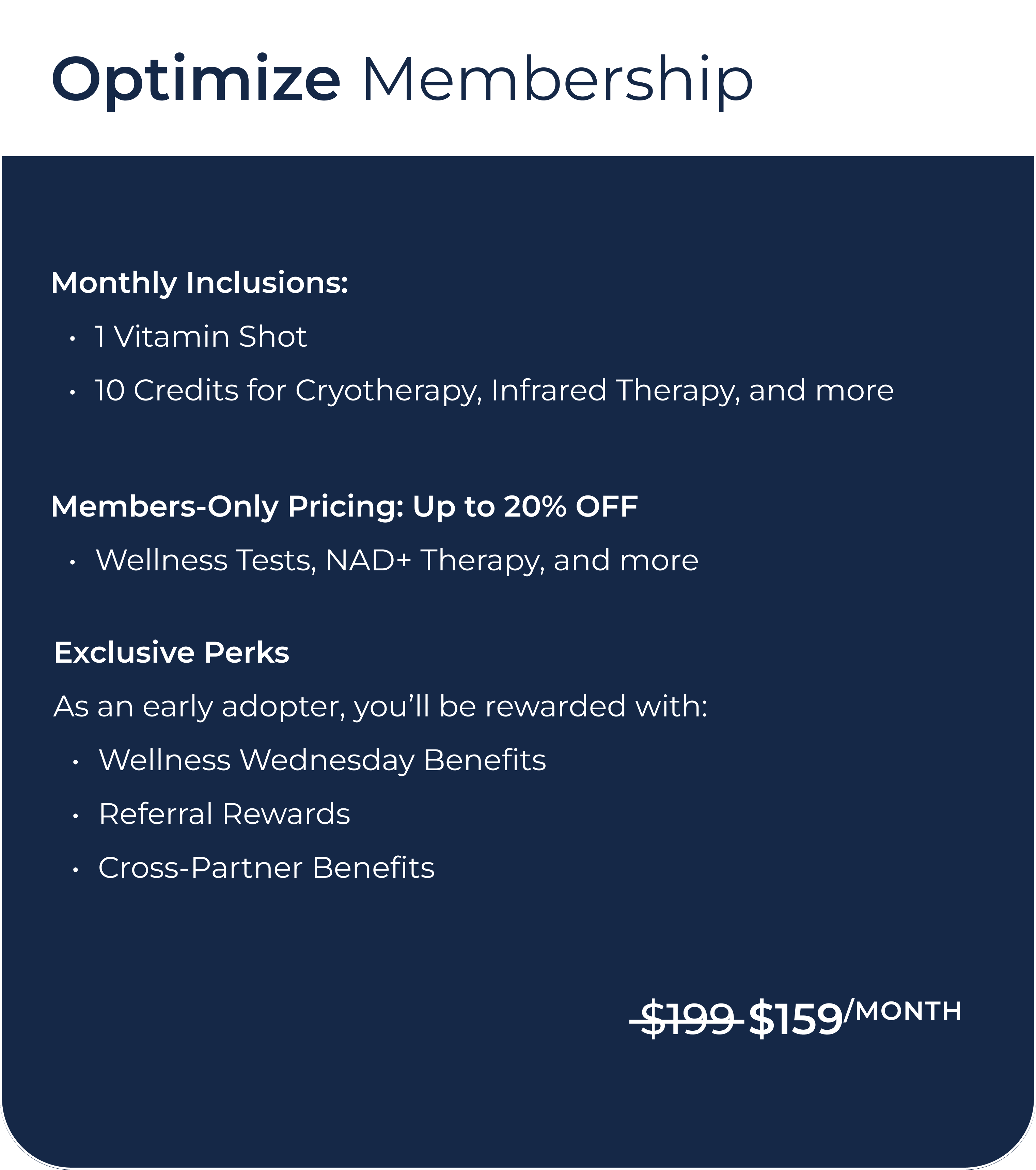 Secure your Founding Membership spot now and enjoy up to 50% off your Monthly Membership rate. As a Founding Member, your Membership includes: IV Therapy, Vitamin Shots, Cryotherapy, Infrared Therapy, and more.
